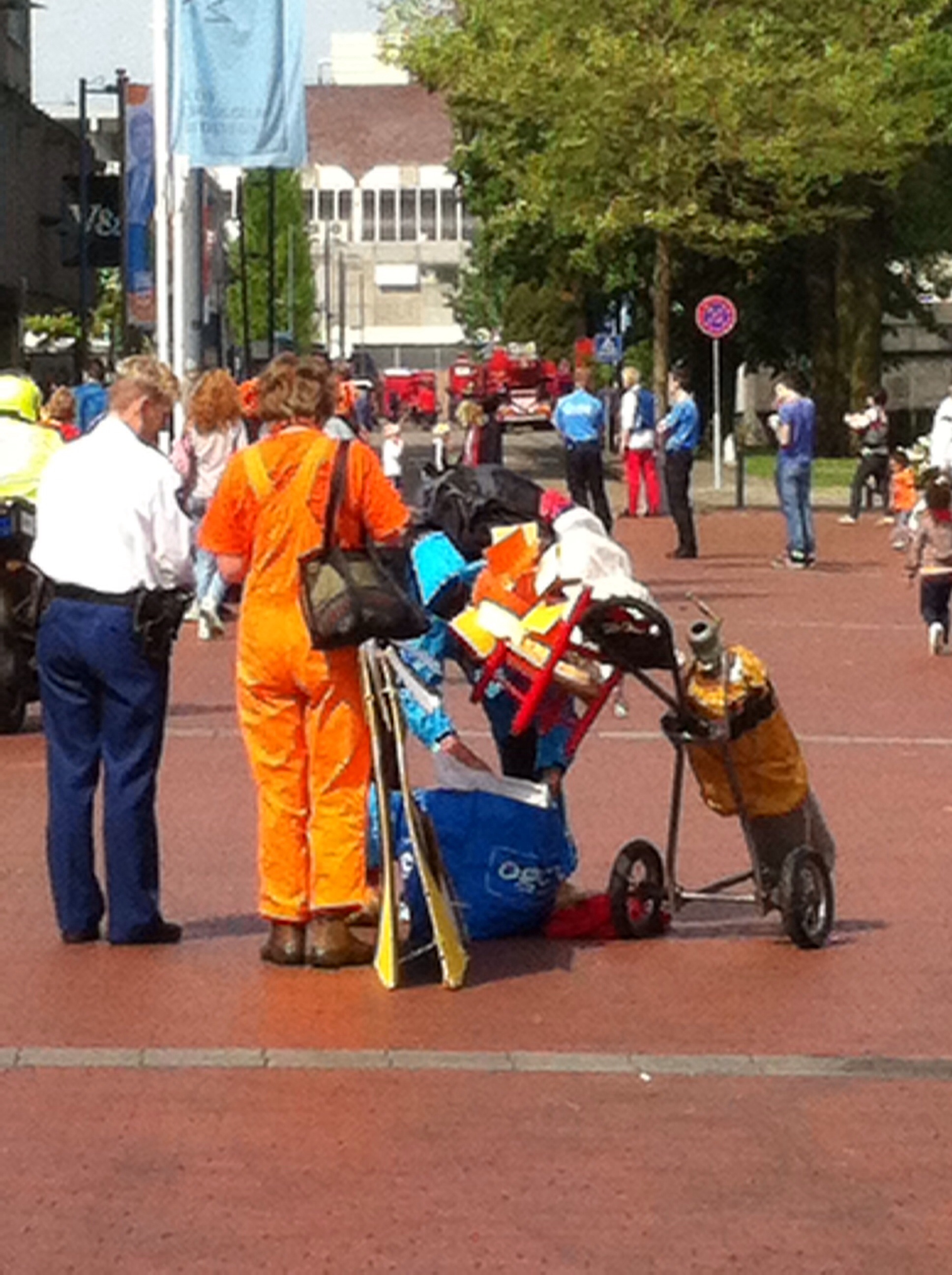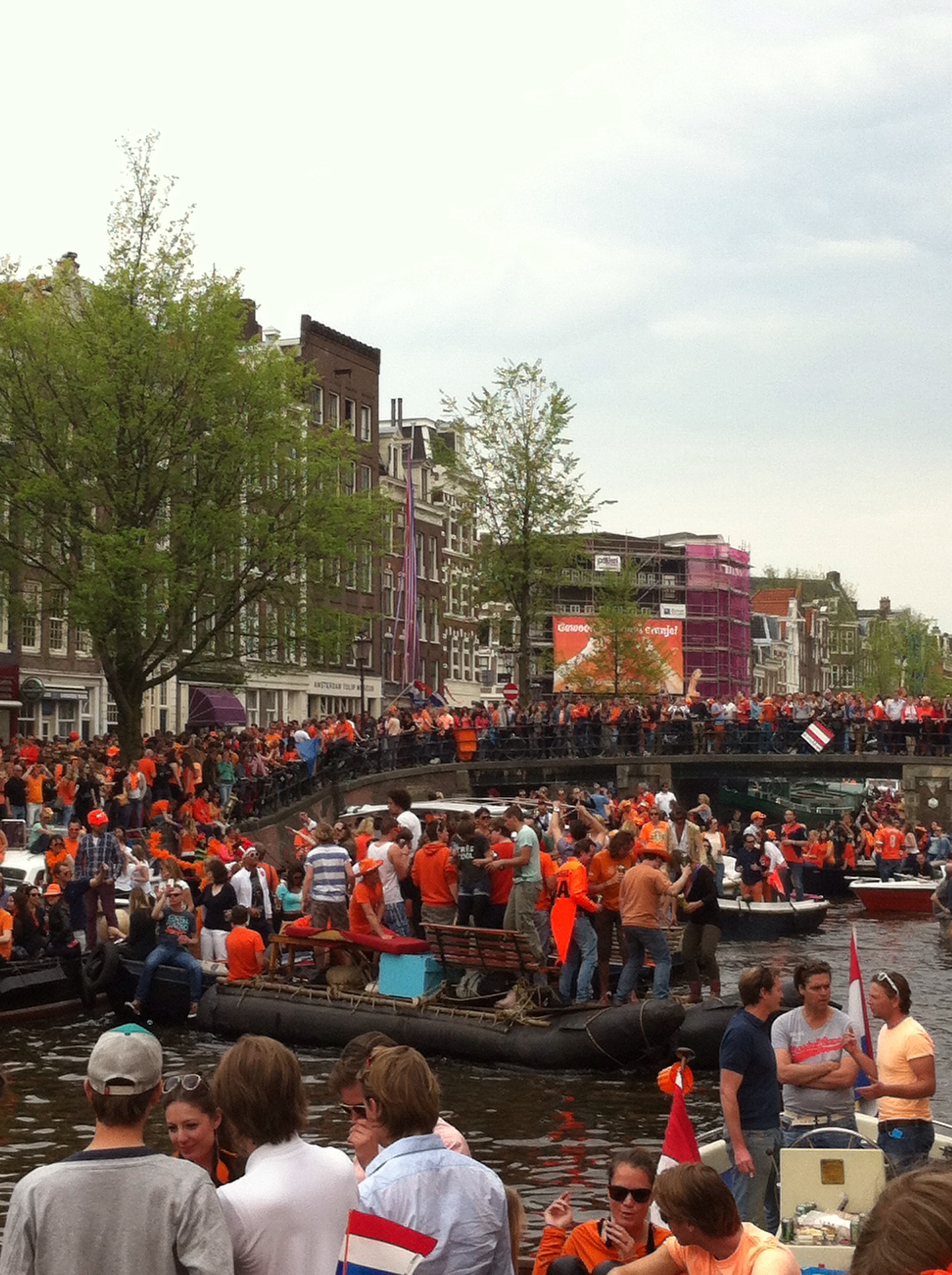 As we approached the centre of Amstelveen we started to see crowds of people adorned in orange, walking slowly to see their monarch. When we finally made it to the centre we were struck by the true absurdness of corporate sponsorship as the moment we got off the bus we were handed ING bank paper flags to wave. It was 11:45 a.m, there were hundreds of people, some wearing inflatable rubber crowns, others already drinking beer and almost everyone was fidgety and bored. From somewhere we couldn’t see we heard a children’s choir start singing a tuneless melody and realised how tactically stupid we were. The problem from our perspective was not the crowd, or the lack of planned viewpoints or even the noise. It was our gene pool. The first lesson we learned on King’s Day is that there is no point ever trying to watch something on King’s Day as Dutch people are so bloody tall. We felt like Lilliputians as we zigzagged through the crowd in the false hope of being able to catch a glimpse of the absolutely nothing which appeared to be going on. Eventually it occurred to us that we weren’t likely to start spontaneously growing so we decided to bugger off. However we couldn’t find off so we took the metro to Amsterdam instead.